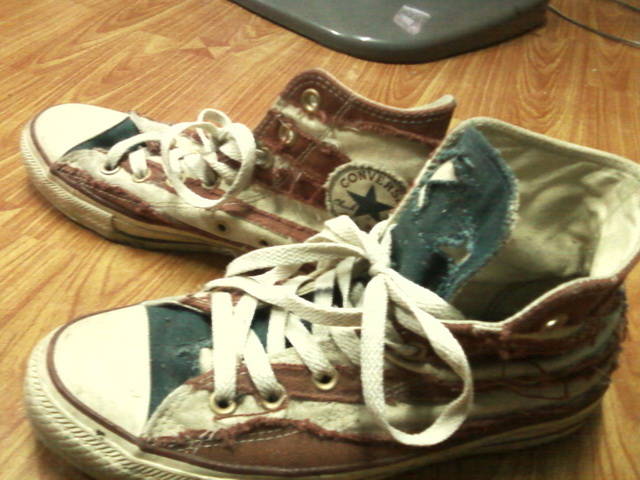 รองเท้า Converse หุ้มข้อ ลายธงชาติสหรัฐอเมริกา เบอร์ 7 มือสอง สภาพเซอร์สุดๆ ยังไม่ซักเพราะอยากคงสภาพเดิมเอาไว้ แต่รูปทรงยังเหมือนเดิม เพราะซื้อมาไม่ค่อยได้ใส่ พื้นยังใหม่ และลายยังสวยมาก อยากขายจริง ๆ ^^'