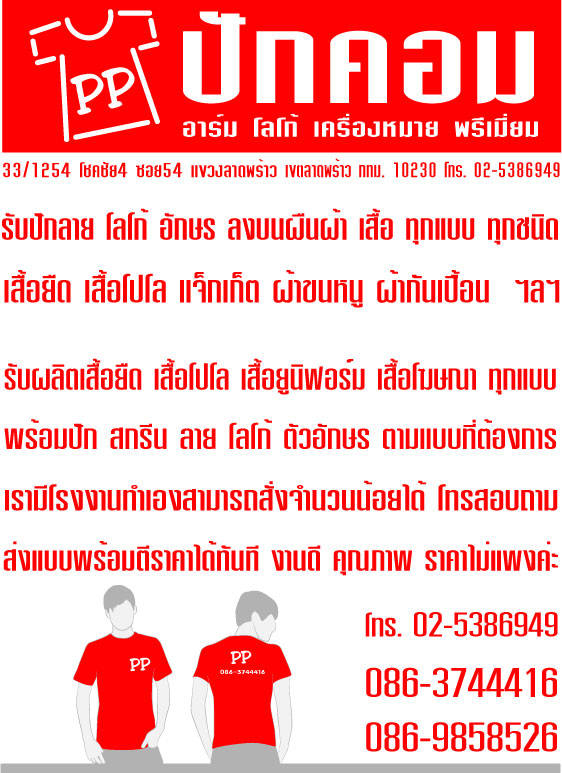 WWW.PPGARMENT.COM รับปัก ปักลาย ปักโลโก้ ปักด้วยจักรคอม ผลิตเสื้อยืด เสื้อโปโล ยูนิฟอร์ม ทุกชนิด รับปักลาย โลโก้ อักษร ลงบนผืนผ้า เสื้อ ทุกแบบ ทุกชนิด เสื้อยืด ผ้าขนหนู ผ้ากันเปื้อน ปลอกหมอน ฯลฯ รับผลิตเสื้อยืด เสื้อโปโล เสื้อยูนิฟอร์ม เสื้อโฆษณา ทุกชนิด