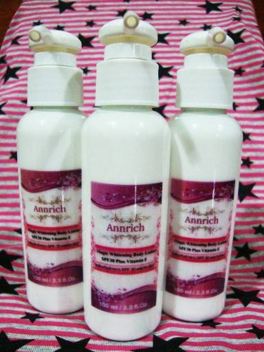 โลชั่นทาผิวกายสูตรผสม AHA และ ไข่มุก ช่วยเร่งการผลัดเซลล์ผิวที่หมองคล้ำให้ขาว เนียน ใส สม่ำเสมอทั่วเรือนร่าง อย่างอ่อนโยน มีสารป้องกันแสงแดด SPF 30 ด้วยค่ะ เริ่ดมากๆ ตัวนี้ทาปุ๊บ ขาวปั๊บเลยค่ะ แอนใช้เป็นประจำ ขาวจริง ใสจริง แอนท้าพิสูจน์ 3 Annrich Magic Whitening Body Lotion SPF 30 Plus Vitamin E โลชั่นบำรุงผิวขาว SPF30 ผสมวิตามินอี ผลิตภัณฑ์ปรับผิวขาวสูตรเข้มข้นพิเศษ ผลิตโดยนาโนเทคโนโลยี ทำให้สารสกัดที่เข้มข้นมีอนุภาคขนาดเล็กในระดับนาโนส่งผลให้สารสกัด สามารถแซกซึมและออกฤทธิ์ต่อเซลล์ผิวระดับลึกได้โดยตรงและมีประสิทธิภาพดี เยี่ยมผสานด้วยเทคโนโลยีการกักเก็บสารสกัดบริสุทธิ์ ไว้ในรูปไลโปโซม ( Liposome) จึงช่วยการนำพาสารและเสริมประสิทธิภาพในการบำรุงผิวให้ดีขึ้นถึง 100 เท่าของเทคโนโลยีทั่วไป และยังคงคุณค่าของสารสกัดให้คงอยู่ยาวนานไม่เสื่อมสภาพ โดยไม่ต้องใช้สารกันเสีย ผลิตภัณฑ์นี้พัฒนาขึ้นเพื่อผิวบอบบาง เหมาะสำหรับทุกคนที่ต้องการปรับสีผิวให้ขาว กระจ่างใส