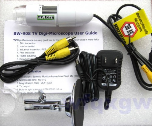 เป็นสินค้ามาใหม่ มีขนาดเล็กพกพาสะดวก เหมาะสำหรับ •ใช้ในการเรียนการสอนวิทยาศาสตร์ • สังเกต ผิว ส่วนตัว •การตรวจสอบ ฟอสซิล และงานอดิเรก • ตรวจสอบพระเครื่อง •เครื่องประดับ นาฬิกา และ ประเมินผล งานศิลปะ •อุตสาหกรรม การผลิต ยกตัวอย่างเช่นตรวจสอบ PCB องค์ประกอบ Electronic •การสังเกต ลักษณะ และ โครงสร้าง •ขยายเพื่อดูพื้นผิวสิ่งของขนาดเล็ก •ตรวจสอบ สิ่งทอ •วิทยาศาสตร์ วิจัย •ดู วิดีโอ ในคอมพิวเตอร์ของคุณ จาก กล้องจุลทรรศน์ ของคุณ •จับ ภาพสี สดใส ด้วย ความละเอียด : 2M (1600 x 1200) Pixel •ภาพ วิดีโอ จะถูกส่ง ไปยังโทรทัศน์ ผ่านทาง พอร์ตAV •คมชัด แสง อัตโนมัติ และ ปรับ โฟกัสได้ •ง่ายต่อการ ติดตั้งใช้งาน Product Specifications: Resolution: Same to Monitor display Max Pixel: 2M (1600 x 1200) Microscope lens with 2 stages Zoom Magnification Rate: 25X - 400X Built-in light source: 4 LED 20000 mLux 5 V DC power (Adapter INCLUDED) video format:PAL