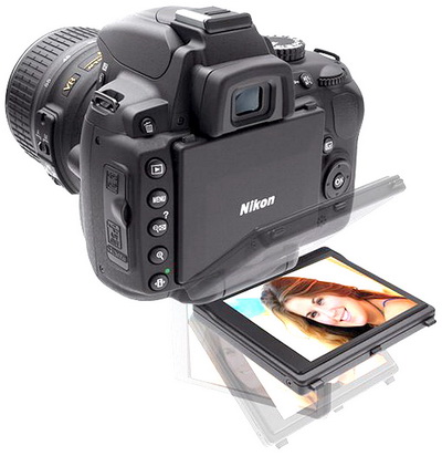 ขนาด 2.7 นิ้ว ความละเอียด 230,000พิกเซล ที่สามารถปรับหมุนและพับขึ้นลงได้ 180 องศา ซึ่งนับเป็นกล้องดิจิตอล SLR ตัวแรกของนิคอน ที่สามารถปรับหมุนจอมอนิเตอร์ได้ ช่วยให้ถ่ายภาพในมุมต่ำ มุมสูง หรือมุมที่มองตามปกติได้ลำบาก และแสดงภาพแบบ Live View ได้เช่นเดียวกับรุ่น D90 โดยเลือกโหมดโฟกัสภาพได้แบบ Contrast-detect AF, แบบ Face Detection และโฟกัสติดตามวัตถุที่มีการเคลื่อนที่ รวมทั้งเลือกพื้นที่โฟกัสได้แบบธรรมดา และแบบมุม