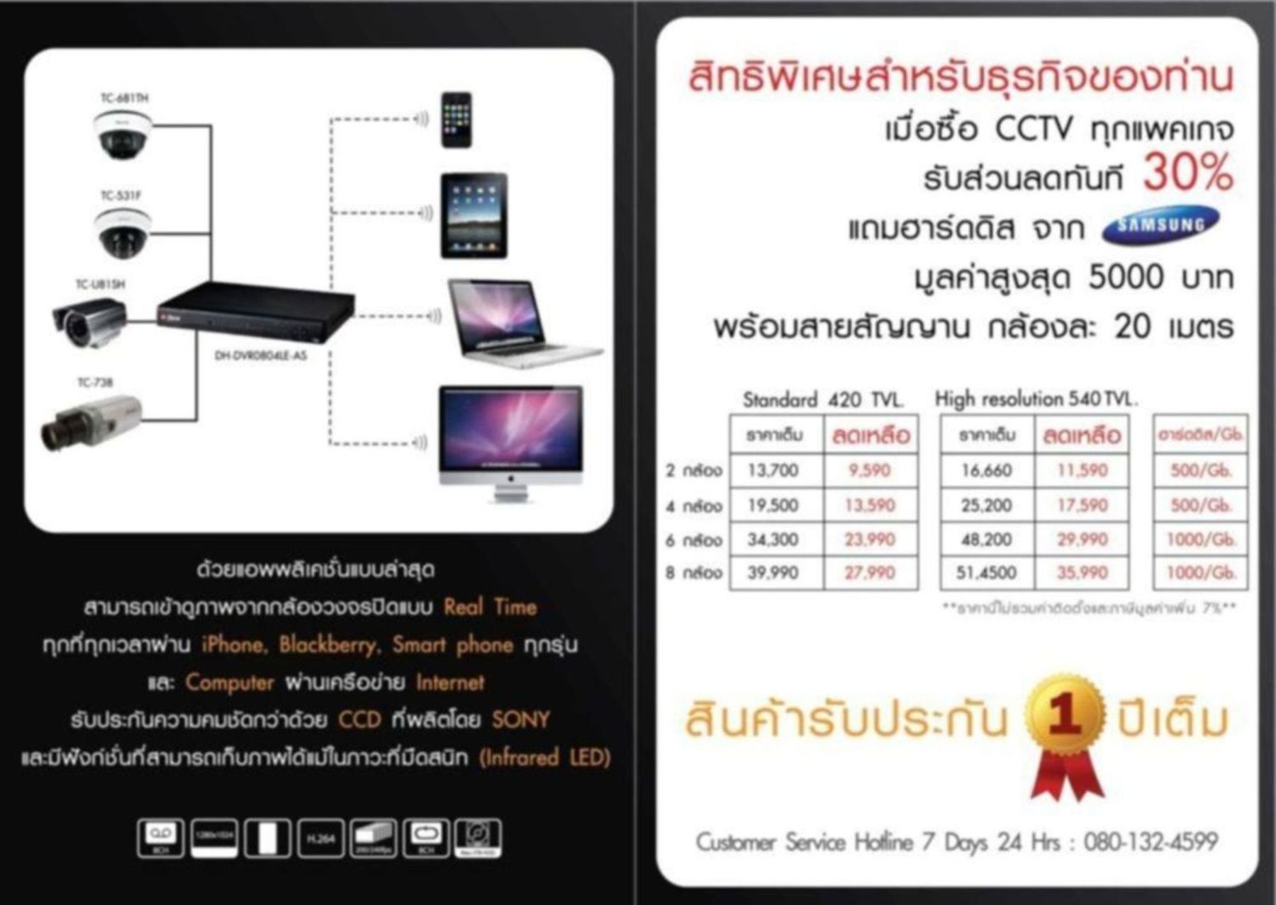 ระบบ CCTV ที่สามารถสอดส่องดูแลธุรกิจของท่าน Real time จาก iPhone / BB / Android / Internet บันทึกภาพสูงสุด 30วันโดยอุปกรณ์คุณภาพสูง รับประกัน 1 ปี เซอร์วิส 24ชม.เพื่อลดความเสี่ยงในการสูญเสียทรัพย์สินและเพิ่มประสิทธิภาพในการจัดการ และควบคุมการปฏิบัติงานในร้าน, Office หรือส่วนการผลิต ขายดีมากๆครับ ตอนนี้มี PROMOTION ลด 30% ครับ ติดต่อ 080 132 4599 / 081 622 6968 Curve CCTV