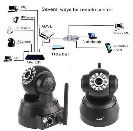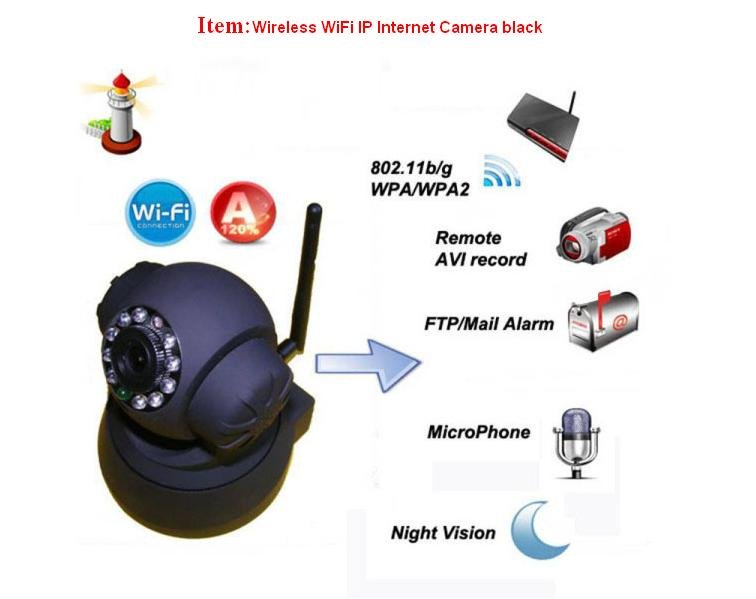 Part I: Hardware 1) Horizontal rotation range 0~ 270 degree , vertical rotation range 0~ 120 degree 2) Motioin JPEG Video Compression 3) Auto Control: White Balance, exposure, Color/Brightness Adjustment, Sharpness, Contrast Light Source 4) 10 X infrared lights 5) Support WiFi 802.11 b/g, wire or wireless can be select. 6) It can be installed on the ceiling or wall. 7) WEP,WPA and WPA2 WiFi Encrypt 8) Microphone and Speaker built-in 9) 1 way on/off alarm input and 1 way relay alarm output Part II: Software 1) Built-in Web Server ,easy and secure web access through web browsers(IE) 2) Plug & Play function, the only thing you need do is connecting it to internet. 3) Auto dial ADSL(PPPoE) and DDNS support. 4) Talk function, you can talk with the people before the camera 5) Support windows Vista. 6) Flexible motion detection and image recording functions 7) Upload motion detected images to a specified FTP server or e-mail. 8) TimeStamp and OSD on the image Paclage inclued: 1) 1 x day & night IP Audio camera 2) 1 x WiFi Antenna 3) 1 x driver CD with install software for IP camera 4) 1 x Networking cable 5) 1 x Brackets 6) 2 x Screws 7) 1 x AC Adapter