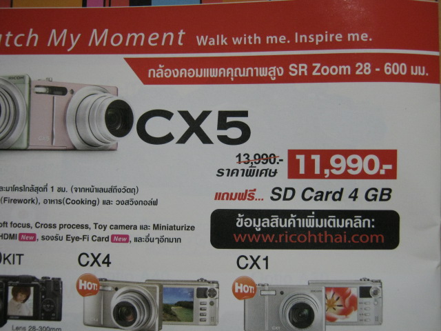 ต้องการขายกล้อง RICOH MODEL CX5 สภาพ 99% ยังไม่เคยใช้งาน ระบบ HYBRID FOCUS 0.2 วินาที มาโคร 1 ซม. SD CARD 2 GB / BATTERY CHARGER / AV CABLE ประกันเหลือ 3 ปี เพิ่งซื้อเมื่อ 3 JULY 2011 ขายแค่ 10,000 บาทเท่านั้น ของใหม่ 11,990 บาท ติดกันรอยแล้ว แถมชุดทำความสะอาด และกระเป๋าหนังอย่างดี (500 บาท) พอดีผมมีกล้อง 2 ตัว เป็น CANON 1100D เลยไม่ได้ใช้ตัวนี้ สนใจโทรมาคุยกันนะครับ