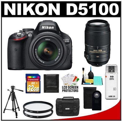 Nikon D5100 16.2 MP Digital SLR Camera & 18-55mm G VR DX AF-S Zoom Lens with 55-300mm VR Lens + 32GB Card + Case + (2) Filters + Remote + Tripod + Cleaning Kit