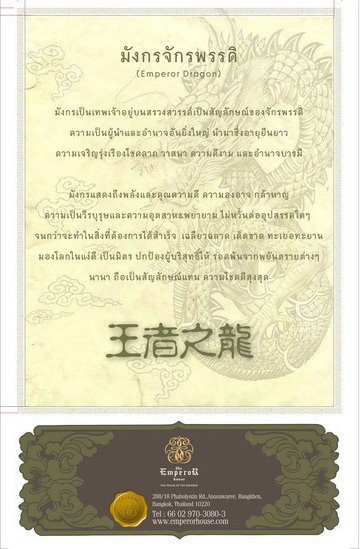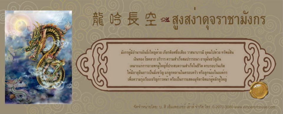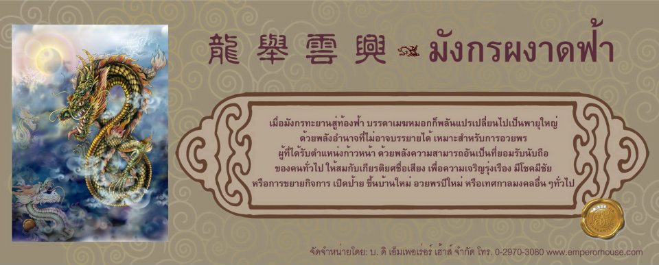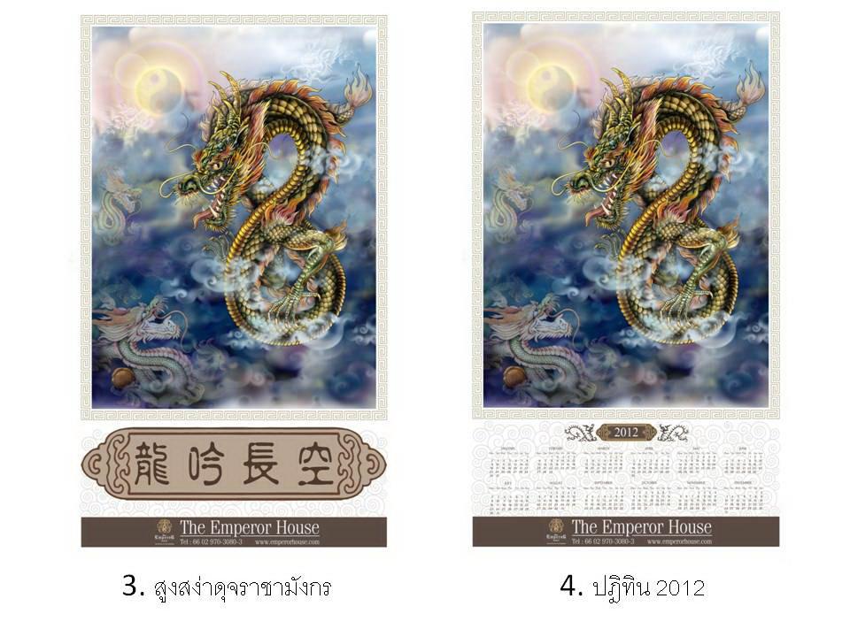 ผลงานภาพจิตรกรรมสื่อผสมอันทรงคุณค่า " มังกรจักรพรรดิ " ต้อนรับปีมังกร โดยผลงานภาพชิ้นนี้ผลิตโดยเทคนิคสื่อผสม ซึ่งเป็นการผสมผสานระหว่างเทคนิคแอร์บรัช และซิลค์สกรีน และมีการแต่งภาพเพื่อให้เกิดมิติและความคมชัดมากขึ้นด้วยเทคนิคไฮเด็นซิตี้บนผืนผ้าใบ ซึ่งเน้นให้ภาพดูมีมิติมากขึ้น ทั้งนี้เทคนิคนี้เป็นเทคนิคเดียวกับงานที่เคยชนะเลิศการประกวดระดับโลกมาแล้ว อีกทั้งยังไม่เคยมีการทำงานในลักษณะเช่นนี้ในการจำหน่ายมาก่อน ภาพจิตรกรรมมังกรจักรพรรดิ นี้จึงเหมาะกับการซื้อเป็นของฝาก ของขวัญในช่วงเทศกาลตรุษจีนที่จะถึงนี้ หรือใช้เป็นการอวยพรแก่คนที่เคารพนับถือได้ตลอดทั้งปี หรือสามารถนำมาใส่กรอบเพื่อประดับตกแต่งบ้าน เพื่อเป็นสิริมงคล และเสริมบารมี อีกด้วย ภาพจิตรกรรมมังกรจักรพรรดิ มีให้เลือก 4 แบบ คือปฎิทิน ปี 2012 และ คำอวยพรภาษาจีนมงคล 3 แบบ สั่งจองได้แล้ววันนี้ที่ 081-3434500 ในราคา 2,999 บาท (ขนาดของภาพโดยประมาณ กว้าง 65 ซม. * ยาว 100 ซม.) บริการส่งฟรีไม่มีค่าใช้จ่าย