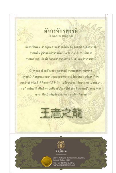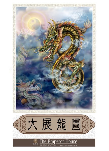 ผลงานภาพจิตรกรรมสื่อผสมอันทรงคุณค่า " มังกรจักรพรรดิ " ต้อนรับปีมังกร โดยผลงานภาพชิ้นนี้ผลิตโดยเทคนิคสื่อผสม ซึ่งเป็นการผสมผสานระหว่างเทคนิคแอร์บรัช และซิลค์สกรีน และมีการแต่งภาพเพื่อให้เกิดมิติและความคมชัดมากขึ้นด้วยเทคนิคไฮเด็นซิตี้บนผืนผ้าใบ ซึ่งเน้นให้ภาพดูมีมิติมากขึ้น ทั้งนี้เทคนิคนี้เป็นเทคนิคเดียวกับงานที่เคยชนะเลิศการประกวดระดับโลกมาแล้ว อีกทั้งยังไม่เคยมีการทำงานในลักษณะเช่นนี้ในการจำหน่ายมาก่อน ภาพจิตรกรรมมังกรจักรพรรดิ นี้จึงเหมาะกับการซื้อเป็นของฝาก ของขวัญในช่วงเทศกาลตรุษจีนที่จะถึงนี้ หรือใช้เป็นการอวยพรแก่คนที่เคารพนับถือได้ตลอดทั้งปี หรือสามารถนำมาใส่กรอบเพื่อประดับตกแต่งบ้าน เพื่อเป็นสิริมงคล และเสริมบารมี อีกด้วย ภาพจิตรกรรมมังกรจักรพรรดิ มีให้เลือก 4 แบบ คือปฎิทิน ปี 2012 และ คำอวยพรภาษาจีนมงคล 3 แบบ สั่งจองได้แล้ววันนี้ที่ 081-3434500 ในราคา 2,999 บาท (ขนาดของภาพโดยประมาณ กว้าง 65 ซม. * ยาว 100 ซม.) บริการส่งฟรีไม่มีค่าใช้จ่าย
