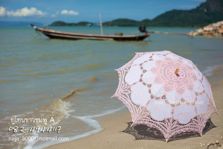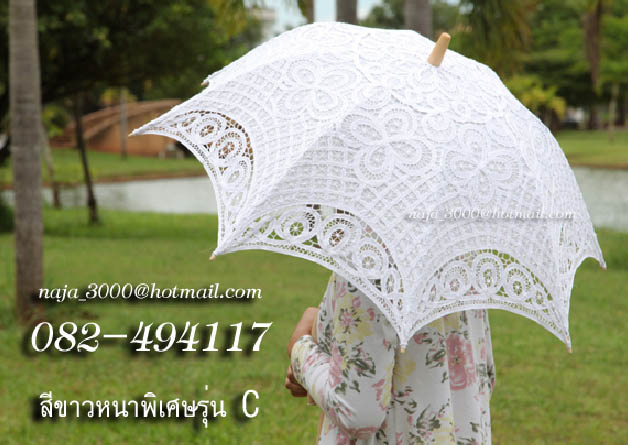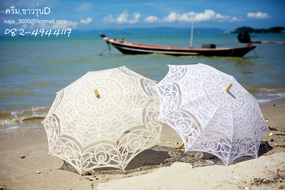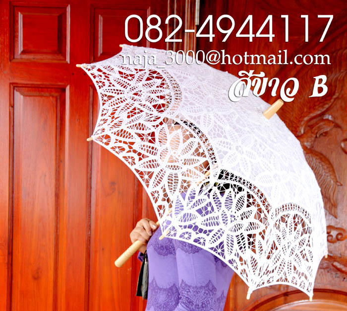 ร่มลูกไม้ สวยหรู ด้ามไม้แท้ สินค้าปราณีต งานนำเข้า สามารถใช้ในงานพิธีมงคลต่างๆ เช่นงานแต่งกลางในขบวนขันหมาก ใช้เป็นอุปกรณ์ประกอบฉาก ถ่ายรูป ถ่ายหนัง ราคาปลีก สีขาว
