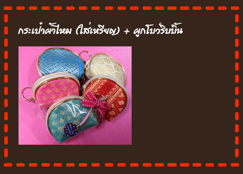 ของชำร่วย กระเป๋าผ้าไหม ใส่เศษเหรียญ (ผ้าไหมคละสี) เดินผสมด้ายทองสวยหรู 300 ชิ้น - 22 บาท 500 ชิ้น -28 บาท 1000 ชิ้น - 26 บาท (ราคาดังกล่าว แพคเกจ + ผูกโบว์+ tagห้อยมือถือชื่อบ่าวสาวฟรี ) เลือกแบบ tag จากหน้า tag ได้เลยค่ะ หรือหากมีแบบอื่นๆ ปรึกษาเราได้เลยค่ะ