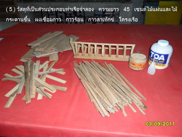 โครงเรือที่ประกอบเสร็จแล้ว( ฉะเพราะโครงเรือ ) หนึ่งลำความยาวของเรือที่ประกอบเสร็จแล้วประมาณ 45 เซนติเมตร ไม้ที่จะประกอบเป็นกระดานขึ้นเรือทั้งหมดรวมทั้งลำประมาณ เกือบร้อยแผ่นส่วนประกอบที่ใช้ในงานเช่นวัสดุคือผงยึดกาว กาวว์ร้อนหนึ่งหลอดกาวว์ลาเท็กซ์หนึ่งกระปุกตาปุเข็ม 1ห่อประมาณร้อยตัว