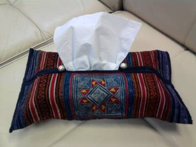 เป็นปลอกกล่องกระดาษทิชชู ที่ทำจากผ้าม้งชาวเขางานปักฝีมือชาวเขาหลากหลายสีสรร