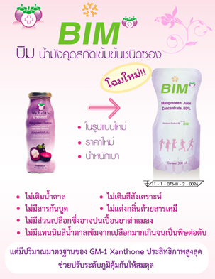 คุณภาพสูง ที่สกัดจากมังคุด บัวบก ถั่วเหลือง งาดำ และ ฝรั่ง แล้วขึ้นทะเบียนกับ อย. เป็นผลิตภัณฑ์เสริมอาหาร จากการทดสอบให้อาสาสมัครสุขภาพแข็งแรงอายุ 25-30 ปี ชาย 4 คน หญิง 3 คน รับประทานครั้งละ 1 แคปซูล วันละ 3 ครั้ง ก่อนอาหารเป็นเวลา 15 วัน แล้ววัดระดับ Interleukin-1 ในเม็ดเลือดขาว หลังการถูกกระตุ้นให้สูงขึ้น พบว่าระดับลดลงอย่างรวดเร็วใน 3 วันแรก และลดน้อยลงในช่วง วันที่ 4-8 หลังจากนั้นจะไม่ค่อยเปลี่ยนแปลง ในขณะที่ระดับ Interleukin-2 เพิ่มขึ้นอย่างรวดเร็วใน 3 วันแรก และเพิ่มน้อยลงในช่วงวันที่ 4-8 หลังจากนั้นจะไม่ค่อยเปลี่ยนแปลง ประสิทธิภาพการปรับระดับภูมิคุ้มกัน ให้สมดุลได้ของผลิตภัณฑ์ OperationBIM เป็น เหตุผลสำคัญที่ทำให้ผู้บริโภคสามารถใช้ ดูแลปัญหาสุขภาพที่เกิดขึ้นจากภูมิ คุ้มกันที่ไม่สมดุลได้อย่างครบถ้วน และผู้ที่ไม่มีปัญหาสุขภาพ จะมีหน้าตาสดใสและมีภูมิคุ้มกันที่ดียิ่งขึ้น อย่างไรก็ตามผลิตภัณฑ์ Operation BIM เป็น ผลิตภัณฑ์เสริมอาหาร อย.มีข้อห้ามมิให้กล่าวอ้างสรรพคุณว่าช่วย ลด บรรเทา แก้ไข หรือรักษาอาการผิดปกติใดๆของร่างกายได้ แต่ผลการวิจัยของ คณะนักวิจัย Operation Bim ทำให้เราสามารถกล่าวได้ว่า ผลิตภัณฑ์ Operation BIM เป็น อาหารที่ทำให้ร่างกายแข็งแรง จากการมีภูมิคุ้มกันที่สมดุล ร่างกายจึงสามารถต่อสู้และป้องกัน อาการผิดปกติทั้งหลายได้ เราเชื่อว่าการค้นพบครั้งนี้จะเป็นการเปิดแนวทางใหม่สำหรับการดูแลสุขภาพ อย่างยั่งยืนที่ทำให้ ร่างกายสามารถยืนหยัดต่อสู้กับโรคทั้งหลายได้ เลขทะเบียน อย.: 51-1-00739-1-0091 ชนิดที่ 2 น้ำมังคุดสกัดเข้มข้น BIM และ น้ำมังคุด Bim&Trim ที่ ผลิตและพัฒนาพิเศษให้มีรสชาติดี โดยไม่เติมน้ำตาล ไม่เติมสีสังเคราะห์ ไม่แต่งกลิ่นด้วยสารเคมี ไม่ใช้สารกันบูด ไม่ผสมส่วนเปลือกจึงไม่ปนเปื้อนยาฆ่าศัตรูพืชและไม่มีแทนนินมากเกินไปจนเป็น พิษต่อตับ แต่มีปริมาณมาตรฐานของสาร GM-1 ซึ่ง คณะนักวิจัยพบว่าเป็นสารธรรมชาติในมังคุด ที่มีประสิทธิภาพสูงสุดในการปรับระดับภูมิคุ้มกันให้สมดุล โดยผู้บริโภคผู้ดื่มน้ำมังคุดสกัดนี้ วันละ 1 ซอง(300cc.) จะได้คุณประโยชน์ GM-1 เท่ากับ ทานเนื้อมังคุด 45 ผล และรู้สึกสดชื่นจากรสชาติ ที่อร่อยพร้อมๆกับการมีสุขภาพสุดยอด เลขทะเบียน อย.: 73-1-04043-2-0027