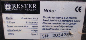 ขายเก้าอี้นวดไฟฟ้า RESTER FAMILY HEALTH MODEL President A-12 ขายเป็นอะัไหล่ตามสภาพ 12,000 บาท 0895303793