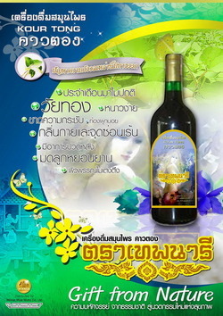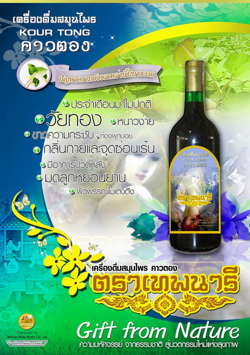 สมุนไพรคาวตอง ตราเทพนารี "แข็งแรงจากภายใน สดใสสู่ภายนอก" หญิงดื่มได้ ชายดื่มดี ประโยชน์ต่อสุขภาพร่างกายในด้านต่างๆ เช่น 1.ด้านกล้ามเนื้อ เส้นเอ็น กระดูก 2.ด้านการไหลเวียนของโลหิต น้ำเหลือง และลม 3.ด้านระบบการขับถ่าย และการขับของเสียต่าง 4.ด้านการสร้างภูมิคุ้มกัน 5.ด้านระบบการย่อย และการดูดซึม 6.ด้านระบบประสาทต่างๆ เช่น สมอง,ตา 7.ด้านผิวพรรณ และกลิ่นกาย 8.ด้านระบบสืบพันธุ์และภายในมดลูกสตรี ฤทธิ์ทางเภสัชวิทยาของคาวตอง 1.ฤทธิ์ทางเสริมภูมิคุ้มกัน กระตุ้นการแบ่งตัวของเม็ดเลือดขาวและช่วยให้เม็ดเลือดขาวทำงานดีขึ้น 2.ฤทธิ์ทำลายเซลล์มะเร็ง มะเร็งเพาะเลี้ยงทั่วไป 5ชนิด ปอด สมอง เนื้อร้าย รังไข่ ลำใส้ใหญ่ และเซลล์มะเร็ง เม็ดเลือดขาว 5 ชนิด 3.ฤทธิ์ฆ่าเชื้อไวรัสชนิด HSV-1,HIV-1 และ Influenza virus โดยไม่ทำลาย Host cell 4.ฤทธิ์ต้านเชื้อรา และแบคทีเรียหลายขนิด และยีสต์ 5.ฤทธิ์ต้านการอักเสบปอดบวมโดยยับยั้งการสร้างสารที่กระตุ้นให้เกิดการอักเสบ ปอดบวม 6.ฤทธิ์ขับปัสสาวะ ประโยชน์ของสมุนไพรคาวตอง ตราเทพนารี กับสุขภาพของสุภาพสตรี 1.ช่วยให้ผิวพรรณเปล่งปลั่ง,ผิวหน้ากระจ่างใส มีน้ำมีนวล,เลือดลมดี,กระชับช่องคลอด,แก้ตกขาว ลดกลิ่นไม่พึงประสงค์,แก้กระบังลมเคลื่อน,คลายปวดเมื่อย เหน็บชา,ปรับสมดุลความดันให้เป็นปกติ,เป็นยาระบายอ่อนๆ สตรีที่ไม่ได้อยู่ไฟ รับประทานแล้วจะทำให้ระบบภายในเป็นปกติ 2.มีผลในการต่อต้านสารก่อมะเร็ง ก้อนเนื้อร้าย ที่เต้านม และมดลูกผิดปกติ เครื่องดื่มสมุนไพรสูตรนี้ช่วยให้ภายในกลับมาดีได้เหมือนเดิม หากรับประทานประมาณหนึ่งเดือน จะรู้สึกได้ถึงความเปลี่ยนแปลง ทั้งสุขภาพและผิวพรรณของร่างกาย 3.สำหรับสุขภาพสตรีที่ใช้เครื่องสำอางอะไร ผิวก็ยังไม่ดีขึ้น หากรับประทานเป็นประจำ จะช่วยให้ผิวพรรณขาวกระจ่าง สดใส ดูดีขึ้น วิธีรับประทาน เหมาะสำหรับสตรี ตั้งแต่อายุ 15 ปีขึ้นไปหรือสตรีที่มีรอบเดือนแล้ว ควรรับประทานตอนท้องว่างจะได้ผลดี (ก่อนอาหารเช้าและก่อนเข้านอน) ควรดื่ม 20-50 ซี.ซี.ต่อครั้ง ดื่มน้ำตามมากๆ (ไม่ควรน้อยกว่าหนึ่งแก้ว) ถ้าเป็นน้ำอุ่นได้จะยิ่งดี *สุภาพบุรุษก็ทานได้ เพื่อให้สุขภาพแข็งแรงใช้ต้านเชื้อมะเร็ง และเชื้อไวรัสุต่าง ๆ* เลขที่ อย.50-2-05653-2-0001 ปริมาตรสุทธิ 750 มิลลิลิตร คำเตือน : สตรีมีครรภ์ห้ามรับประทาน สนใจติดต่อวนิดา 0810222057 หรือ
