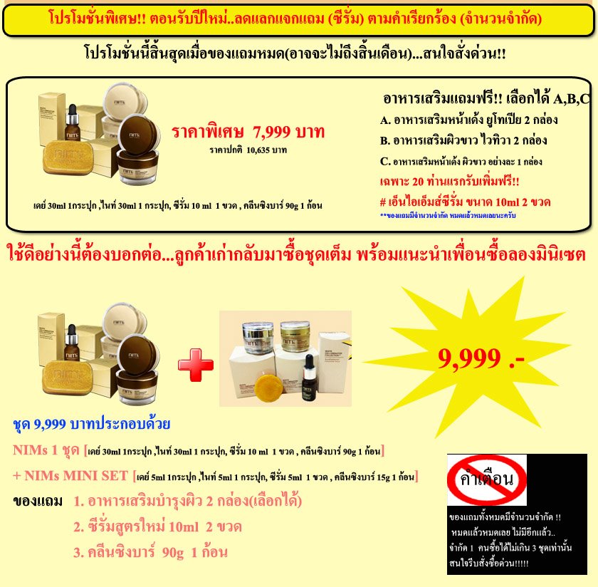 นวัตกรรมผลิตภัณฑ์บำรุงผิวขาว ผลิตภัณฑ์ แรกที่แก้ปัญหาผิวคล้ำที่เกิดจากกรรมพันธุ์ ปัญหาเดียวที่ไม่เคยมีใครแก้ได้จริง เพราะกระบวนการทำงานสามารถแก้ปัญหาได้ลึกถึงระดับยีน ทำให้ผิวขาวกระจ่างใสอย่างมีออร่าจากข้างใน อย่างที่ไม่เคยเกิดขึ้นมาก่อนกับคนผิวคล้ำแต่กำเนิด ด้วยผลิตภัณฑ์ครีมหน้าใสจาก NIMs NIMs ตอกย้ำการเปิดตัวผลิตภัณฑ์ครีมหน้าขาวอันน่ามหัศจรรย์ เพื่อผิวหน้าขาวราวปาฎิหารย์ ครั้งแรกของโลก... ที่ผิวคล้ำแต่กำเนิด ก็ขาวขึ้นได้ เปิดตัวเพียงไม่กี่เดือนดาราไทยก็ติดใจ ใครๆใช้ก็ทัก.. …..ฟรีค่าจัดส่งทั่วประเทศ….. เรากล้าท้าพิสูจน์ครีมผิวขาวให้ทดลองด้วยตัวเอง ยินดีคืนเงิน 100,000 บาท หากมีผลิตภัณฑ์อื่นที่ทำให้ขาวกว่า อย่าพลาด โปรโมชั่นพิเศษ ต้อนรับ ปี 2555 คุ้มสุดๆ ลดกว่า 70% พร้อม โปร ซื้อ 1 แถม 1 อีกมากมาย หากสนใจสั่งซื้อ สามารถโอนเงินเพื่อซื้อสินค้าเข้าตามบัญชีด้านล่างนี้ได้เลยครับ