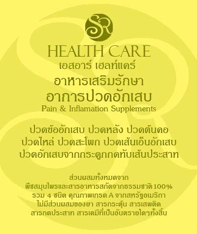 อาหารเสริมรักษาอาการปวดเส้นเอ็นอักเสบ ปวดข้ออักเสบ ปวดหลัง ปวดต้นคอ ปวดไหล่ ปวดสะโพก ปวดอักเสบจากกระดูกกดทับเส้นประสาท ได้ผลดีที่สุด สกัดจากพืชธรรมชาติ 100% คุณภาพเกรด A จากสหรัฐอเมริกา ขอแนะนำอาหารเสริมเอสอาร์เฮลท์แคร์ อาหารเสริมรักษาอาการปวดอักเส