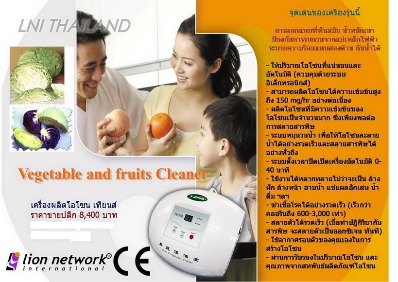 จำหน่ายเครื่องผลิตโอโซน Vegetable and fruits Cleaner ข้อมูลจำเพาะ:คุณสมบัติของผลิตภัณฑ์ เครื่องผลิตโอโซน เทียนส์ เพื่อสุขภาพ ล้างผัก ผลไม้ อาหาร เนื้อสัตว์ กำจัดกลิ่น เอนกประสงค์ จุดเด่นของเครื่องโอโซนเทียนส์ * การออกแบบที่ทันสมัย น้ำหนักเบา ป้องกันการรบกวนจากคลื่นแม่เหล็กไฟฟ้า ระบายความร้อนแบบสองด้าน กันน้ำ * ให้ปริมาณโอโซนที่แน่นอน และ อัตโนมัติ (ควบคุมด้วยระบบอิเล็กทรอนิคส์) * สามารถผลิตโอโซนได้ถึง 150 mg/hr อย่างต่อเนื่อง * ผลิตโอโซนที่มีความเข้มข้นของโอโซนเป็นจำนวนมาก ซึ่งเพียงพอต่อการสลายมลพิษ * ระบบหมุนวนน้ำ เพื่อให้โอโซนละลายน้ำได้อย่างรวดเร็ว และสลายสารพิษได้อย่างทั่วถึง * ระบบตั้งเวลาปิดเครื่องอัตโนมัติ 0 – 40 นาที * ฆ่าเชื้อโรคได้อย่างรวดเร็ว (เร็วกว่าคลอรีนถึง 60 – 3,000 เท่า) * สลายตัวได้รวดเร็ว (เมื่อทำปฏิกิริยากับมลพิษจะสลายตัวเป็นอ๊อกซิเจนทัน ที) * ใช้งานได้หลากหลายไม่ว่าเป็น ล้างผัก เนิ้อสัตว์ ล้างหน้า อาบน้ำ บ้วนปาก แช่แผลอักเสบ น้ำดื่ม ฯลฯ * ให้อากาศรอบตัวคุณในการสร้างโอโซน * ผ่านการรับรองในปริมาณโอโซนและคุณภาพ CE ปกติราคา 8,400 บาท ลดราคาพิเศษ 7,500 บาท สนใจโทร084-8100304 คลิ๊กดูที่ http://www.youtube.com/watch?v=7oM7_TirkIU