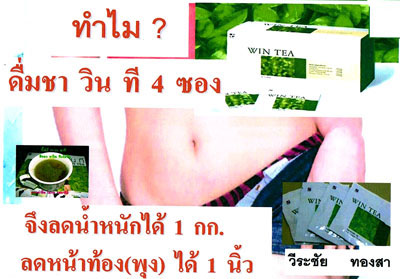 ด้วยผลิตภัณฑ์ ชาวิน ที(WIN TEA) ซึ่งผลิตจากสมุนไพรชั้ยยอดคือ ชาเขียว(Green Tea)ญี่ปุ่น , บัวหลวง ,พลับจีน และโสมไซบีเรีย คุณสามารถล้างสารพิษในลำไส้ และไขมันทั้งหมดในลำไส้ได้จริง