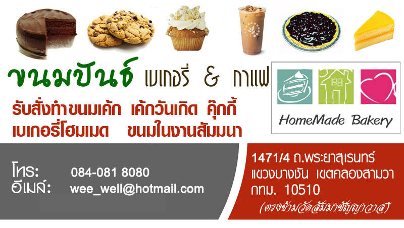 ขนมเค้ก เค้ก หลากหลายชนิด เน้นรับทำส่งตามเบเกอรี่ ร้านกาแฟ และรับทำเค้ก/คุ้กกี้ปีใหม่ เค้กวันเกิด
