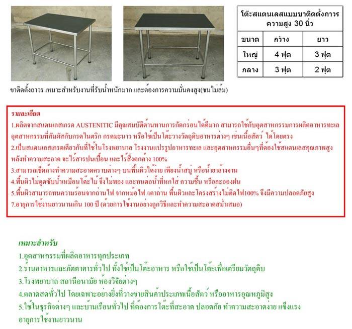 โต๊ะสแตนเลส 100% แบบขาติดตั้งถาวร สูง 30 นิ้ว