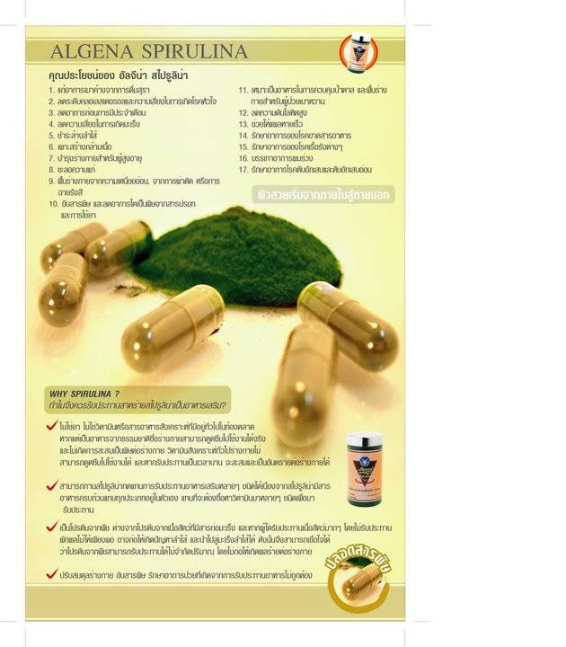 สาหร่ายสไปรูลิน่า สารพัดประโยชน์รับประทานเพื่อควบคุมน้ำหนัก บำรุงผิวพรรณ ลลดอาการปวดประจำเดือน ลดไขมันในเส้นเลือด ชำระสารพิษตกค้างในร่างกาย บำรุงรากผมให้แข็งแรง ฯลฯ รับประทานวันละ 6 แคปซูล หลังอาหาร ลองแล้วจะรู้ว่าได้ผลจริงๆ สินค้าดีมี อย.รับประกันความปลอดภัย