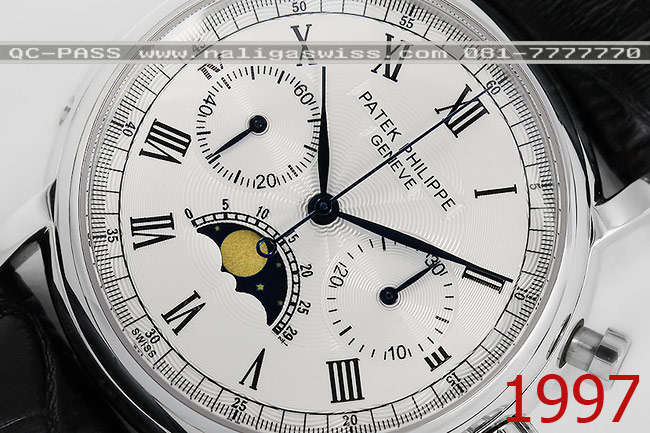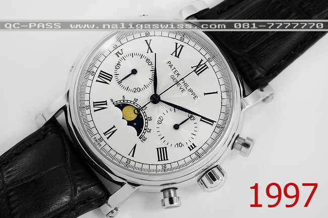 PATEK PHILIPPE Chronograph / Moon Phase หน้าปัดขาว (King Size 40 mm.) คนชอบนาฬิกาหรูๆ แนว คลาสสิค ฟังก์ชั่น Chronograph สามารถจับเวลาได้จริง แถมยัง สามารถแสดง Moon Phase (ข้างขึ้นข้างแรม) ได้จริง หน้าปัดลายกิโยเช่ มีประกายสวยงาม รูปถ่ายจากสินค้าจริง