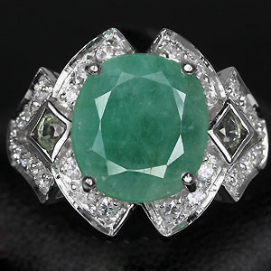 ลักษณะ : แหวนเงินชุบทองคำขาวประดับพลอยแท้มรกต เป็นพลอยแท้น้ำงาม สีเขียว เจียรเป็นทรงรูปไข่ น้ำหนักพลอย 5.20 กะรัต ไฟดี สีสวย น้ำงาม ขนาดของพลอย 11.8x10.8x5.5 มม.ล้อมด้วยพลอยแท้เนื้อแข็งสีขาวและขียว ขนาด 3x3xมม.2 ชิ้น,ขนาด 1.7x1.7xมม. 12 ชิ้นและขนาด 1.5x1.5xมม. 16 ชิ้น แบบสวยหรู สง่างามทันสมัยใส่ได้ทุกโอกาส งานฝีมือช่างจิวเวลลี่จันทบุรี ตัวเรือนเป็นเงินน้ำหนักเงิน 6.21 กรัมขนาดแหวนเบอร์ 54 หรือ size 7 **ลด-เพิ่มขนาดไม่คิดค่าบริการ**(( ฟรีกล่องกำมะหยี่สุดหรู ))