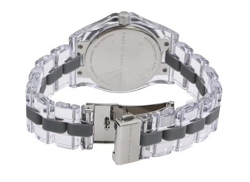 คุณสมบัติ For undeniably darling style, the choice has never been more clear! Choose this Marc by Marc Jacobs™ watch for the chicest accessory around! Stainless steel case. Clear acrylic bracelet with white rubber inserts. Three-hand analog quartz movement. White dial with colorful logo markers. Fold-over clasp with push-button closure. Water resistant 3 ATM/30 meters. Dimensions: Face Width 40mm Face Depth 11mm Face Height 40mm Band Width 20mm Band Circumference 9 1/2 inches