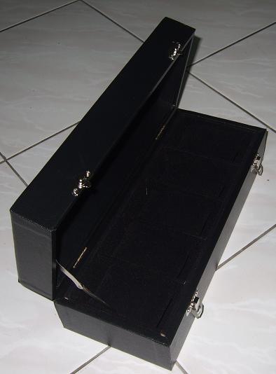 กล่องสะสมนาฬิกาใหม่มือหนึ่ง เป็นกล่องไม้หุ้มด้วยหนังสีดำ ภายในบุกำมะหยี่ พร้อม หมอนรัดนาฬิกา มี 3 สี สีแดง สีดำ และสีเทา ฝาเป็นกระจกใส