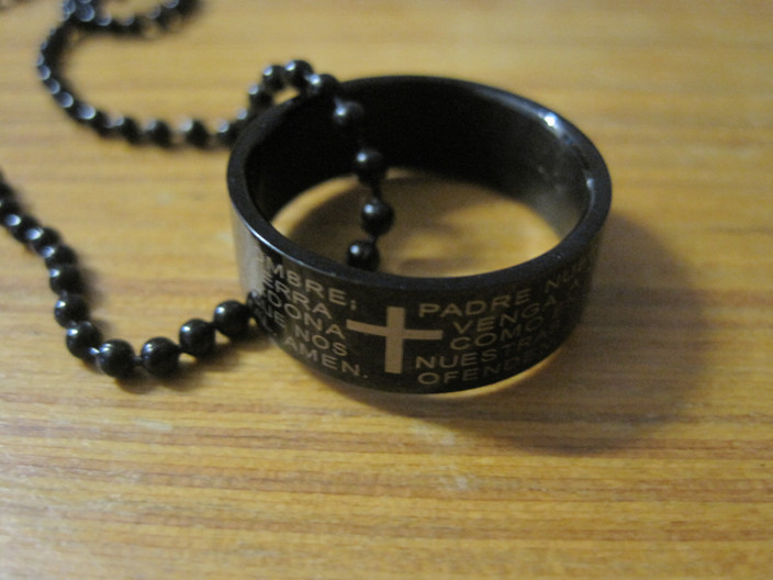 แหวน Christ Ring เป็นสแตนเลสสตีล สีดำ เคลือบเงาวิ๊งๆ ใส่ได้ทั้งชายและหญิง ลายรอบๆตัวแหวน คือคำสวดอธิษฐานขอบคุณพระเจ้า คิดว่าเป็นภาษาสเปน ไซท์ 11 เส้นผ่าศูนย์กลาง 20.68 มม. เส้นรอบวง 64.1 มม. รีบกันหน่อย 200 บาทเท่านั้น (ค่าส่ง 30)