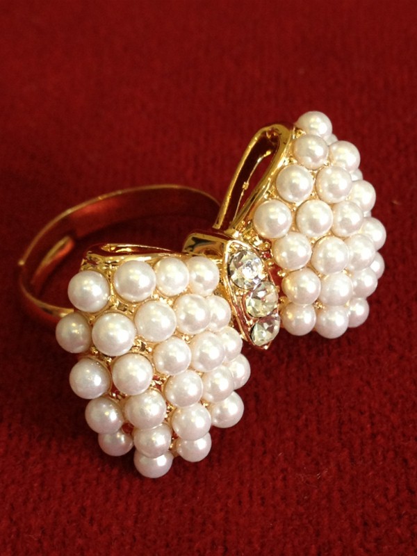 แหวนแฟชั่นลายโบว์น่ารัก เหมาะกับสาวหวาน กิ๊บเก๋ ประดับด้วยลูกปัดมุขสีขาว ขนาดขยายได้ตามนิ้วของผู้ใส่