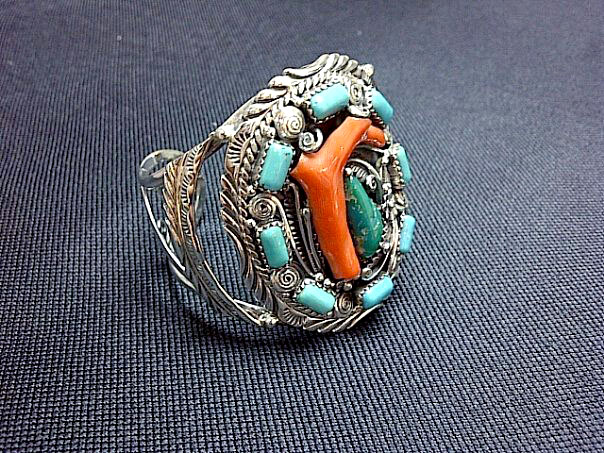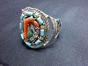 กำไลเงิน อเมริกัน-อินเดียน Indian natives. ควอยส์แท่ง 8 เม็ดล้อม + ควอยส์อริโซนา เม็ดกลาง + ปะการังกิ่งสีแดงสด หายาก น่าเก็บสะสม สอบถามรายละเอียดก่อนได้ครับ