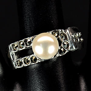 ลักษณะ : แหวนเงินประดับไข่มุกขาว เป็นไข่มุกแท้ ประดับ Marcassite ด้านข้างตัวเรือนเพิ่มความเก๋ ขนาดหน้าตัวเรือน 25x20 มม.ใส่ได้ทุกโอกาส งานฝีมือช่างจิวเวลลี่จันทบุรี ตัวเรือนเป็นเงิน น้ำหนักเงิน 4.10 กรัม
