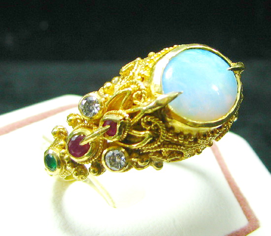 แหวน อยุธยาโบราณ หัวโอปอล์ เพชร ทับทิม มรกต ชิ้นนี้เป็นงานเก่า แบบงานสวยมาก ขึ้นมือทั้งชิ้น โอปอล์ สีสวยมาก เพชรก็ขาว สวย เหลี่ยมไฟดี ไม่มีตำหนิ