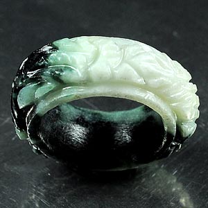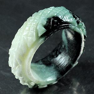 ลักษณะ : แหวนเงินหยกไทยสีเขียวขาวแกะสลักเป็นลายมังกรรอบวง น้ำหนัก 63.55 กะรัต เป็นหยกไทยแท้สีเขียวขาว เป็นที่นิยมในหมู่ผู้ชาย งานแกะสลัก ใส่ไว้เพื่อเป็นสิริมงคล งานฝีมือช่างจิวเวลลี่จันทบุรี ตัวเรือนเป็นหยก
