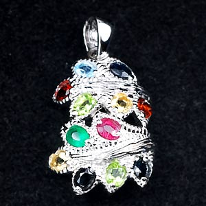 ลักษณะ : จี้เงินประดับพลอยแท้มี ทับทิม,ไพลิน,อะความาลีน,โกเมน,เพอริดอด,ซิทริน,มรกตเจียรทรงรูปไข่ น้ำงาม ไฟดี หายาก แบบเก๋ลวดลายใบไม้ งานฝีมือช่างจิวเวลลี่จันทบุรี ตัวเรือนเป็นเงินรวมน้ำหนัก 5.17 กรัม ขนาดกว้าง 3.5 ซม. ยาว 1.9 ซม.