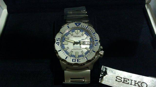 ขายนาฬิกา Seiko Snow Monster (Limited Edition) ของใหม่ แกะกล่อง มีใบรับประกันและบัตรรับสายยางมูลค่า 1500 บาท (ฟรี) จาก บ.ไซโก้ นาฬิการุ่นนี้ผลิตออกมาขายเฉพาะประเทศไทยมีจำนวนจำกัดเพียง 2,555 เรือนเท่านั้น ขณะนี้สินค้าจำหน่ายหมดเกลี้ยงแล้วทุก Dealer ทำลายสถิติเปิดจองวันแรก มีคนจองสินค้าหมดทุกแห่งภายใน 1 ชม. นาฬิกาเรือนจริง สวยมาก สวยกว่าที่เห็นในรูป หน้าปัดสีขาวหิมะ ขอบสีน้ำเงินแทนความหมาย ท้องฟ้า ตัวเรือนด้านไม่ขัดมัน แทนเกล็ดน้ำแข็ง