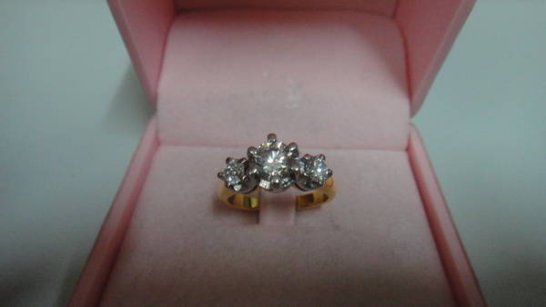 ตัวเรือนเป็นทองหนัก 6g เพชรเม็ดกลาง1เม็ดหนัก0.64ct เม็ดข้าง2เม็ดน้ำหนักรวม0.35ct