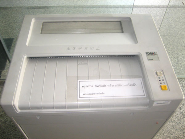 003ต้องการขาย เครื่องทำลายเอกสาร ขนาดกลาง ยี่ห้อ IDEAL 3802 สภาพ 90% เป็นของเยอรมัน แข็งแรงทนทาน ขนาด A3 A4 ทำลายได้ครั้งละ 1-22 แผ่น สามารถทำลายลวดเย็บกระดาษ ลวดหนีบได้ ราคาตอนซื้อมา 70000 บาท ต้องการขายราคาถูก