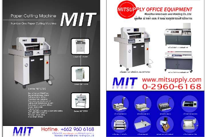 เครื่องตัดกระดาษไฟฟ้ารุ่น MIT 4605 ตัดกระดาษกว้าง 460 มม ตัดกระดาษได้หนา 500 แผ่น เหมาะกับศูนย์ถ่ายเอกสาร (70 แกรม) ระบบกดทับต้นฉบับแบบอัตโนมัติแบบแยกอิสระ ระบบความปลอดภัยด้วยระบบอินฟาเรท (รุ่นใหม่ล่าสุด) ค่าความคลาดเคลื่อน 0.3 มม ใช้ไฟ AC 220V 50Hz กำลังไฟ 580W ใบมีดถอดออกได้ง่าย และสามารถนำออกมาลับได้เพื่อความคมของใบมีด ใบมีดสามารถปรับความสูงต่ำได้ง่าย มีแสงเลเซอร์บอกตำแหน่งในการตัดเพิ่มความแม่นยำ ใช้ไฟฟ้า 220V 50Hz กำลังมอเตอร์ 800 วัตต์ ขนาดเครื่อง 780x590 x1050 น้ำหนัก 120 กิโลกรัม รับประกัน 1 ปี on side service เชิญชมวีดีโอสาธิตการทำงานได้ที่ www.mitsupply.com เตรียมตัวพบกับศูนย์บริการภาคเหนือ ครอบคลุม จังหวัดทางภาคเหนือ ได้แก่ เชียงราย เชียงใหม่ ลำปาง พะเยา แพร่ น่าน อุีตรดิตถ์ ฯลฯ เรามุ่งมั่นพัฒนาเคียงคู่ธุรกิจคุณเพื่อให้เราเดิน ไปข้างหน้าอย่างมั่นคง +++++++++++++++++++++++++++++++++++++++++++++++++ บริษัท แม็กซ์ไอเดียอินเตอร์เทรดแอนด์โฮลดิ้ง จำกัด ผู้นำเข้าและจัดจำหน่ายเครื่องตัดกระดาษไฟฟ้าภายใต้แบรนด์ MIT และ สินค้าเกี่ยวกับอุปกรณ์สำนักงานต่างๆ