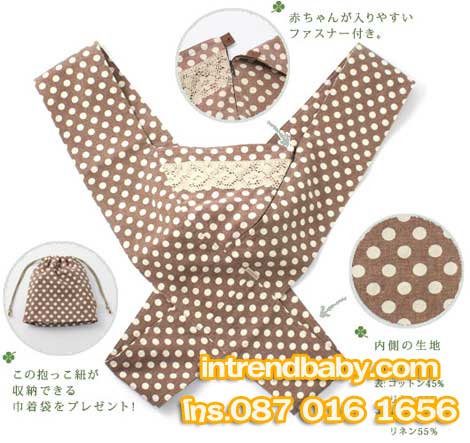 จากญี่ปุ่นนะค่ะ และได้รับการออกแบบช่วงสายอุ้มเป็นพิเศษเพื่อให้รองรับน้ำหนักได้อย่างมีสมดุล ระหว่างสะโพก ไหล่และหลัง