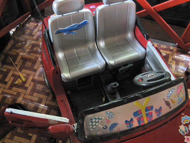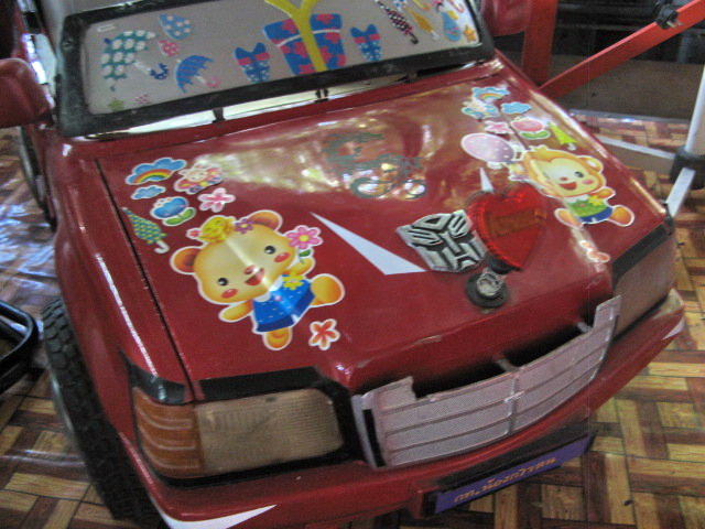 เป็นรถสีแดงตกแต่งเอง ตัวรถเป็นไฟเบอร์คับ รับรองไม่มีขายทั่วไป ระบบ 2 มอเตอร์ใหญ่ในการขับเคลื่อน (ไม่ใช้มอเตอร์เล็กที่มีขายในห้างนะคับพวกนั้นไม่ทนรับน้ำหนักได้น้อย) รถผมรับน้ำหนักได้ดี แข็งแรง สามารถให้เด็กนั่งกับเพื่อนได้ ไว้ฝึกหัดขับรถได้อย่างสบาย