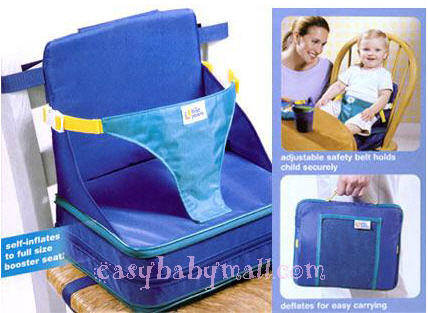 Our On-The-Go Booster Seat seems to appear and disappear like magic. Pull out the valve and it self-inflates into a sturdy and comfortable full-size booster seat; the adjustable safety belt with T-restraint helps hold your child securely. Mealtime over, just press out the air and fold down the back. With a self-carry handle, it's compact, lightweight and ready to go. Take it anywhere. It is available from 9 to 36 months.