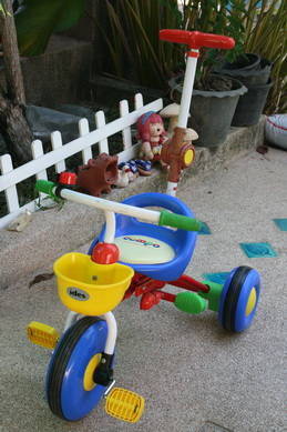 มีที่เข็น ที่พักเท้า กระดิ่ง ล้อเป็นยาง(ทนกว่าพลาสติก) พับเก้บได้ ไม่สะดวกไปส่งไปรษณีย์ มารับเองนะคะ บ้านอยู่มหาชัยเมืองใหม่ (มาได้สองทางคือ ถ เิอกชัย ถ พระราม2)