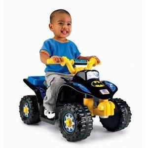 Battery-powered Batman 4-wheeler with utility rack on the back is the perfect vehicle for little hero adventures! Designed with toddler-friendly features for the littlest riders, like a large push-button on the handlebar for simple stop-and-go and built-in footrests. Drives an exciting, but safe, 2 mph (max.) on hard surfaces and grass. Includes 6-volt battery and charger. Adult assembly and direct adult supervision required. Recommended for outdoor use only.