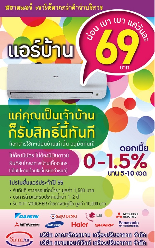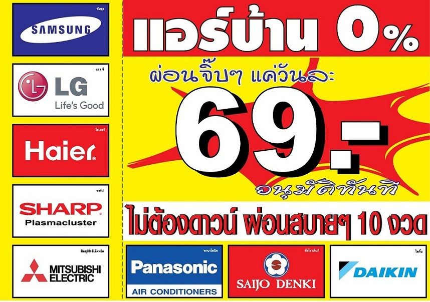 ผ่อนแอร์บ้านวันละ 69 บาท ไม่ต้องใช้บัตรเครดิต ไม่ต้องดาวน์ ใช้เพียงทะเบียนบ้านและบัตรประจำตัวประชาชนเท่านั้น อนุมัติทันที ฟรีค่าติดตั้ง ฟรีรางครอบท่อน้ำยา บริการ 2 ปี รับประกันน้ำยา 2 ปี ยินดีต้อนรับโครงการเอื้ออาทรทุกโครงการ บริษัทฯ เรามีสาขาในกรุงเทพและปริมณฑลกว่า 30 สาขา