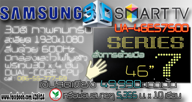 SAMSUNG 3D SLIM SmartTV UA-46ES7500 600hz 1080P ภาพลื่นคม ของเหมือนใหม่ อายุ3วัน แถมแว่นx4