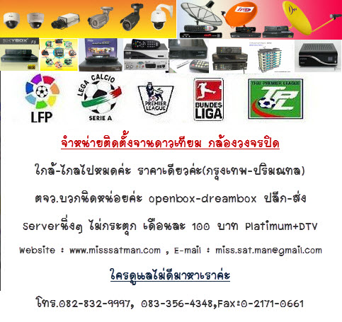 รับติดตั้ง กล้องวงจรปิด CCTV ทุกรุ่น วางระบบเคเบิ้ลทีวีLAN/NETWORK สัญญาณกันขโมย บ้าน/อาคาร คอนโด/อพาร์ทเม้นท์ และ ตู้สาขาโทรศัพท์ทุกระบบ จำหน่าย/ติดตั้ง/ซ่อมจานรับสัญญาณดาวเทียมทุกระบบ Skybox F3 /Dream box / open box HD Platinum HD + DTV แบบรายเดือนเบาๆ Server dream box Open box 150 บาท/เดือน เกรดพรีเมี่ยม ชัด ไม่มีกระตุก พร้อมอัพเดต อย่างต่อเนื่องเพื่อการดูที่ได้อรรถรถไม่กระตุก ไม่ค้าง บริการหลังการขาย Online 24 ชม. โทรแจ้งล่วงหน้าก่อน 2ชม. สินค้ารับประกัน 1 ปี เปลี่ยนใหม่ทันทีไม่ต้องรอซ่อม ใครดูแลไม่ดีมาหาเราค่ะ โทรปรึกษาเรา เราพร้อมตอบโจทย์คุณได้ทุกปัญหา 082-832-9997, 083-356-4348 ยินดีให้บริการค่ะ แวะชมสินค้า web เราค่ะ http://www.misssatman.com