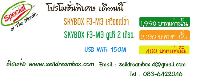 Skybox F3-M3 HD 1080p ขาย 1,990 บาท ประกันบวกลงโปรแกรมพร้อมดู - เดือน (083-6422046) Skybox F3-M3 HD 1080p ขาย 2,190 บาท ประกันบวกลงโปรแกรมพร้อมดู 2 เดือน (083-6422046) อุปกรณ์ ในกล่อง 1. ตัวเครื่อง มีนาฬิกาพร้อมช่อง 2. ชิพแท้จากโรงงาน SKYBOX.CC ของแท้แน่นอน 3. รีโมท+อแดปเตอร์ 4. สาย MINI AV+สาย HDMI 5. คู่มือ+สาย RS232 +ถ่าน AA 2ก้อน 6. IR Sensor