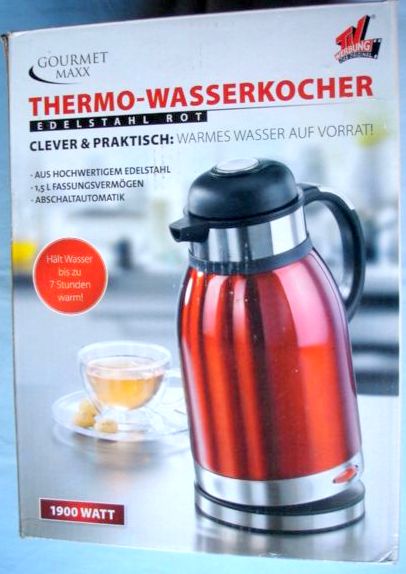 Gourmet Maxx กระติกหรือกาต้มน้ำร้อน สแตนเลส สีแดง ความจุ 1.5 ลิตร Gourmet Maxx – Thermodynamic Kettle, Stainless Steel, red, 220-240 V,1600-1900 W,1500ml สามารถเก็บความร้อนได้นานถึง 7 ชม. และสามารถเก็บความเย็นได้ด้วย สแตนเลสอย่างดี คุณภาพยุโรป มีสินค้าจำนวนจำกัด เรามีราคาสำหรับผู้ที่สนใจซื้อไปเพื่อขาย กรูณาติดต่อมาที่เบอร์โทร หรือทางอีเมล์